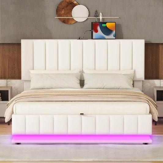 Queen Size Upholstered Bed with Hydraulic Storage System and LED Light, Modern Platform Bed with Sockets and USB Ports, White