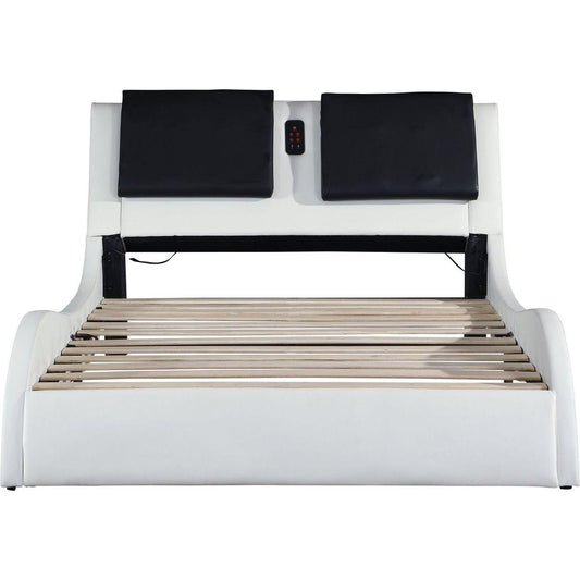 Faux Leather Upholstered Platform Bed Frame with led lighting, Bluetooth connection to play music control,Backrest vibration massage,Curve Design, Wood Slat Support, No Box Spring Needed,Queen