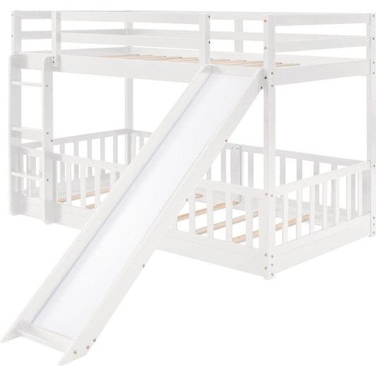 Full and Twin Size L-Shaped Bunk Bed with Slide and Short Ladder, White