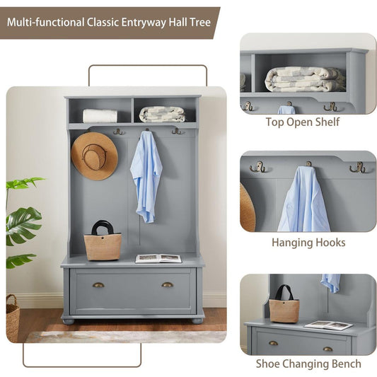 Classic Cosatal Style Hall Tree Entryway Bench with Open Shelves and Shoe Cabinets, SOLID WOOD Feet, Gray, 40"Wx18.5"Dx64.5"H