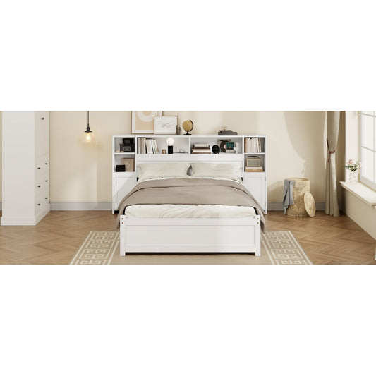 White Wooden Storage Bed with Tall Extended Bookcase Headboard, 6 Drawers and Charging Station for Teens Adults, No Box Spring Needed,Full
