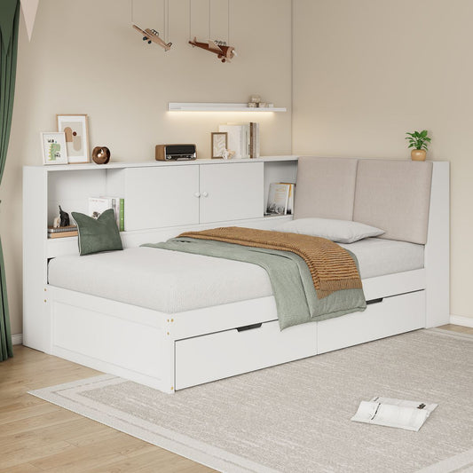 White Wooden Full Size L-shaped Daybed with Storage Bookcase, Upholstered Headboard, USB Charging Ports