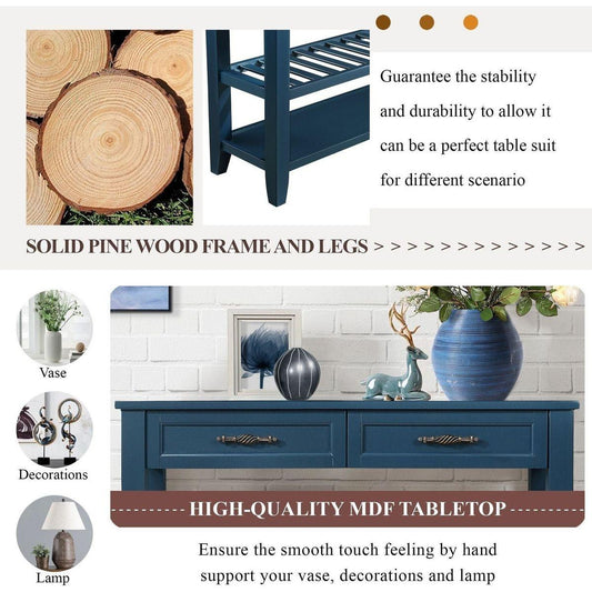 Console Sofa Table with 2 Storage Drawers and 2 Tiers Shelves, Mid-Century Style 42" Solid Wood Buffet Sideboard for Living Room Furniture Kitchen Dining Room Entryway Hallway, Navy Blue