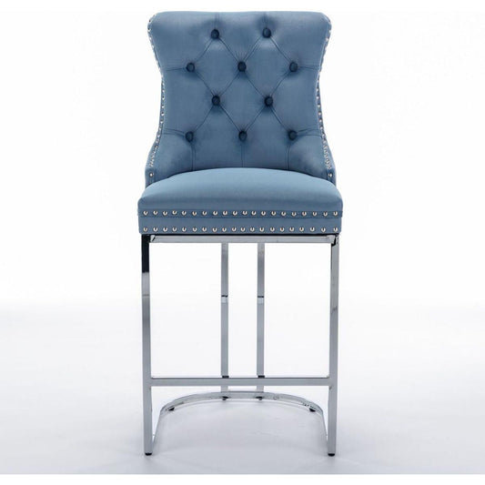 Contemporary Velvet Upholstered Barstools with Button Tufted Decoration and Wooden Legs, and Chrome Nailhead Trim, Leisure Style Bar Chairs,Bar stools, Set of 2 (Light Blue)