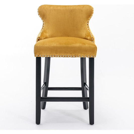 Contemporary Velvet Upholstered Wing-Back Barstools with Button Tufted Decoration and Wooden Legs, and Chrome Nailhead Trim, Leisure Style Bar Chairs, Bar stools, Set of 2 (Gold)