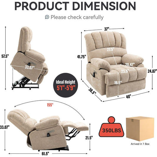 23' Seat Width and High Back Large Size Beige Chenille Power Lift Recliner Chair with 8-Point Vibration Massage and Lumbar Heating