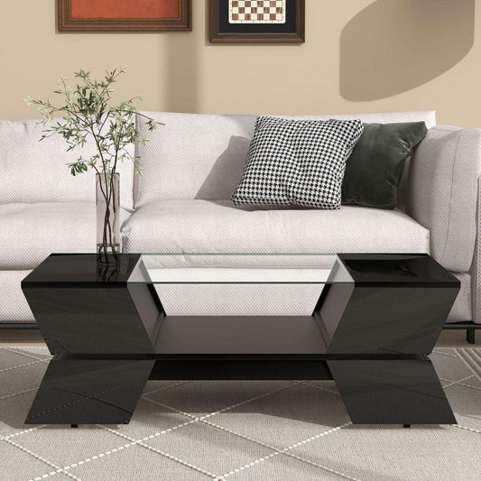 6mm Glass-Top Coffee Table with Open Shelves and Cabinets, Geometric Style Cocktail Table with Great Storage Capacity, Modernist 2-Tier Center Table for Living Room, Black