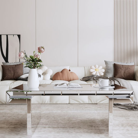 Luxury Rectangular Mirror Coffee Table with Fluted Tempered Glass, Light Luxury Style, Easy Assembly