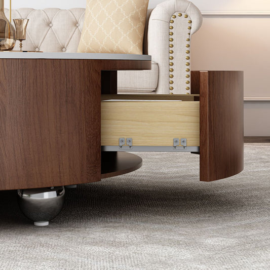 31.49'' Round Coffee Table with Storage Small Coffee Table for Apartment, Modern Living Room Coffee Table with Sturdy Pedestal,WALNUT