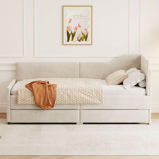 Twin Size L-Shaped Corduroy Daybed,Upholstered Bed Frame with 2 Storage Drawers, Beige