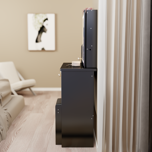 29.2' Small Size Left Drawer Desktop Vanity Table + Cushioned Stool, Extra Large Right sliding mirror, Multi Layer High Capacity Storage, Practical Fashionable Dresser, Suitable For Small Space