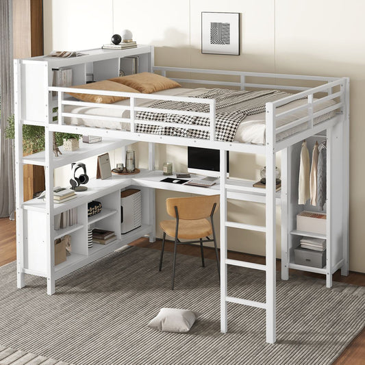 Metal Loft Bed with Wardrobe And L-shaped Desk, Queen Size Loft Bed with Storage Cubes and Shelves, Heavy Duty Loft Bed for Kids Teens Adults, White