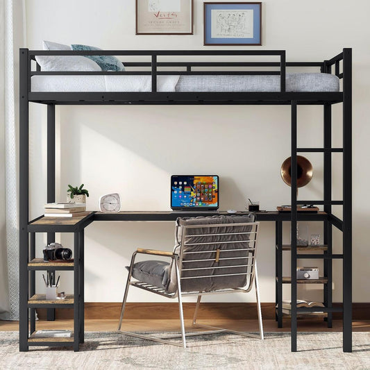 Full XL Metal Loft Bed with Desk and Shelves, Loft Bed with Ladder and Guardrails, Loft Bed Frame for Bedroom, Black