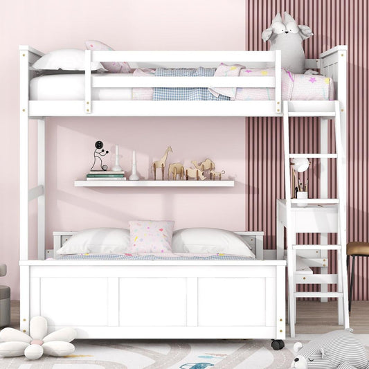 Full size Loft Bed with Drawers and Desk, Wooden Loft Bed with Shelves - White