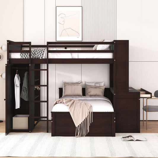 Full size Loft Bed with a twin size Stand-alone bed, Shelves, Desk, and Wardrobe-Espresso