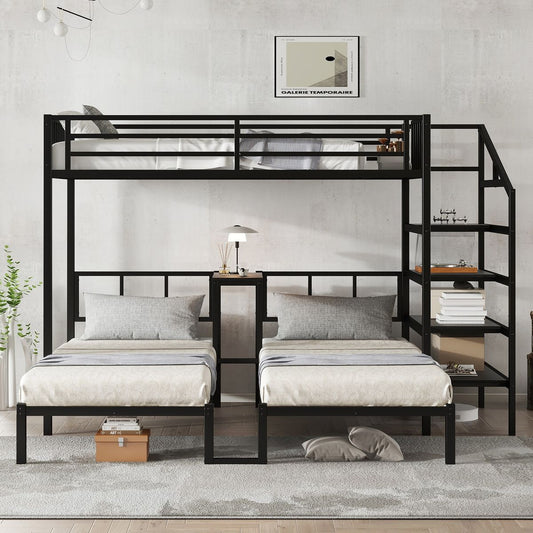 Twin over Twin & Twin Bunk Beds for 3, Twin XL over Twin & Twin Bunk Bed Metal Triple Bunk Bed with Desk & Shelves, Space Saving/Noise Reduction, Black