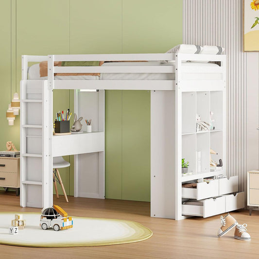Full Size Loft Wood Bed with Desk, Storage shelves and Drawers, Built-in Ladder, High Loft Bed with Desk, Storage Shelves and Drawers,Guardrails,White