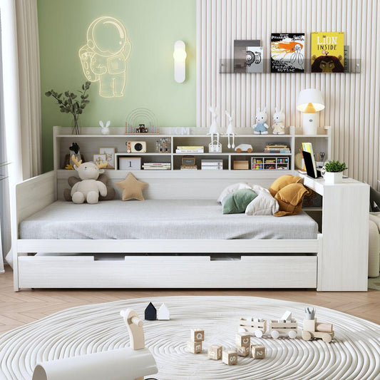 Wooden Full Size Daybed with Storage Shelves, Multi-functional Bed with Twin Size Trundle Bed and Study Desk, Antique White