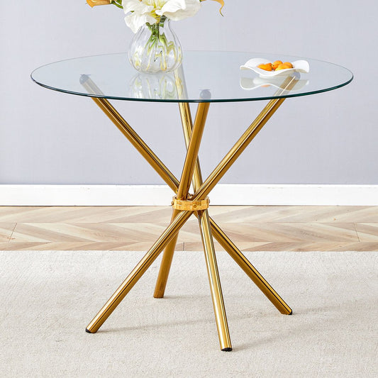 Round clear glass dining table with a unique shape for 4-6 people, with ring-shaped gathered gold metal legs, suitable for desks, kitchens, terraces, dining rooms.