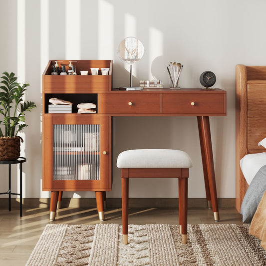 Modern Makeup Vanity Desk with Drawers, Cabinet & Charging Port, Space-saving Dressing Table Set with Stool for Small Places, Walnut