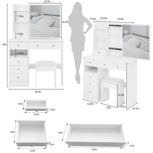 37' Middle Size Left Drawer Desktop Vanity Table + Cushioned Stool, Extra Large Right sliding mirror, Multi Layer High Capacity Storage, Practical Fashionable Dresser, Suitable For Large Space