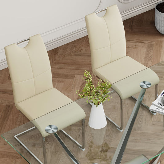 Modern style glass dining table, elegant transparent design, sturdy stainless steel base, Beige dining chairs set, electroplated chair legs, suitable for dining room and kitchen (set of 5)