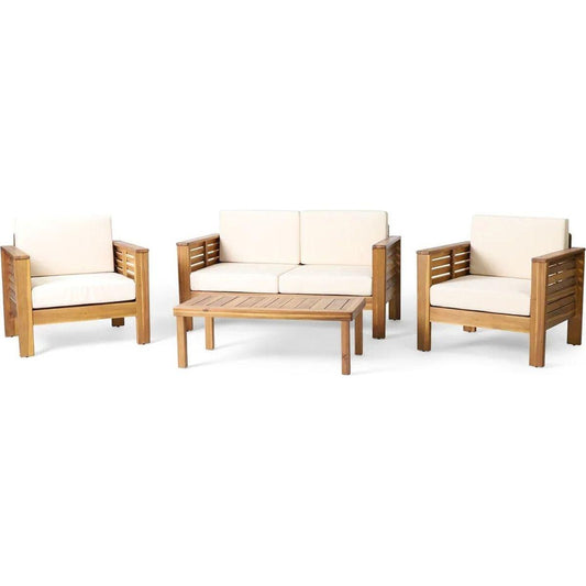 Teak Acacia Wood Loveseat and Coffee Table Set with Cream Cushions