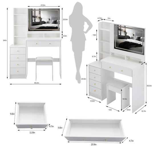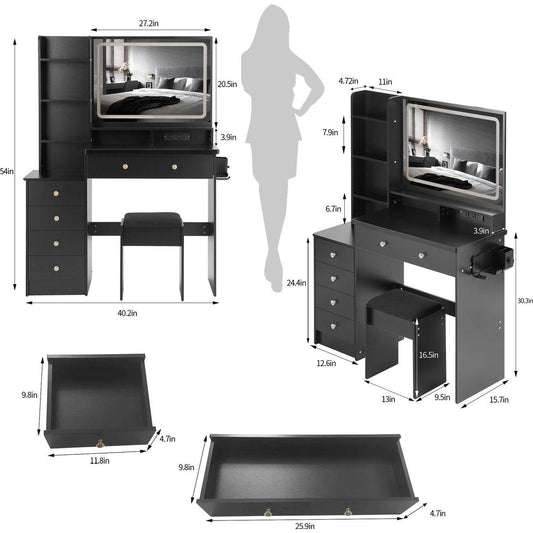 41' Large Size Left Drawer Desktop Vanity Table+Cushioned Stool Dresser Set, 2 AC+2 USB Power Station, Hair Dryer Stand, Extra Large Touch Control LED Mirror, 3-color Switch, EPA, GCC, UL Certificate