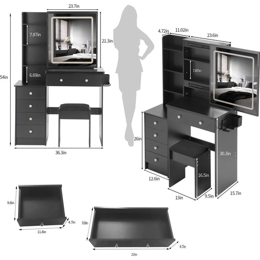 37' Middle Size Left Bedside Cabinet Vanity Table + Cushioned Stool Dresser Set, 2 AC+2 USB Socket, Hair Dryer Stand, Large Touch Control LED Sliding Mirror, 3-color Switch, EPA, GCC, UL Certificate