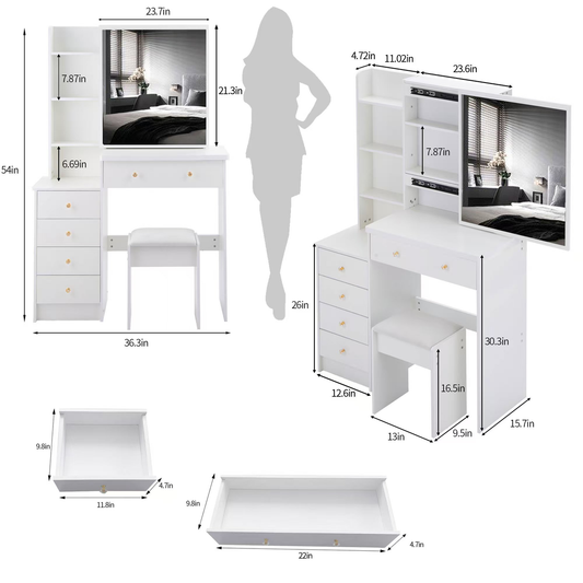 37' Middle Size Left Bedside Cabinet Vanity Table + Cushioned Stool, Extra Large Right sliding mirror, Multi Layer High Capacity Storage, Practical Fashionable Dresser, Suitable For Middle Space