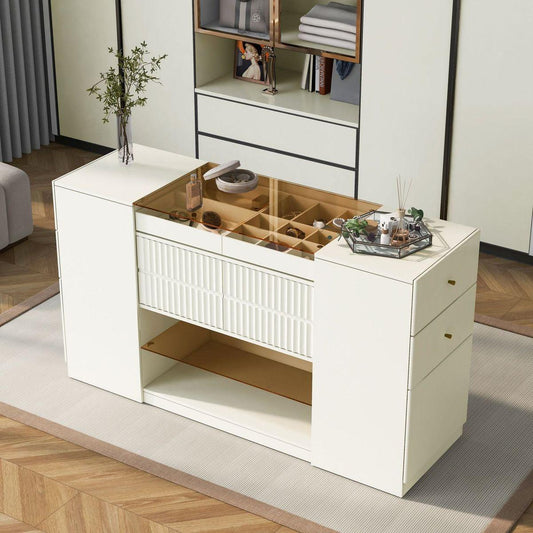 Modern Luxury Multi-Functional Island Vanity Dresser and Storage Cabinet with Glass Tabletop, Display Shelf,6 Drawers for Walk-in-Wardrobe and Bedroom
