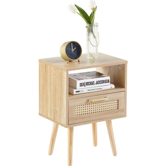 15.75" Rattan End table with drawer and solid wood legs, Modern nightstand, side table for living roon, bedroom, natural