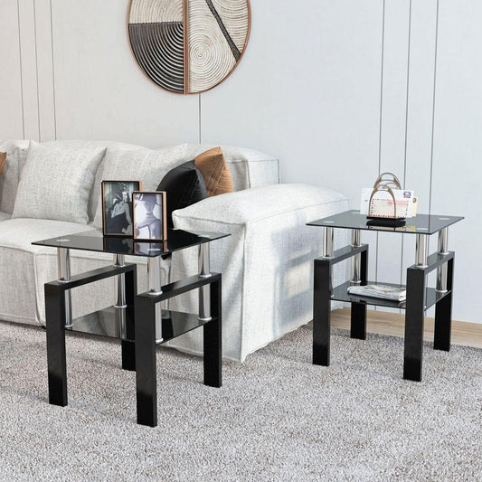 Set of 2, Modern Tempered Glass Tea Table Coffee Table End Table, Square Table for Living Room, Black