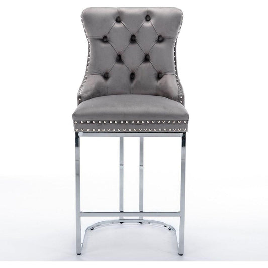 26" Counter Height Bar Stools Set of 2, Modern Velvet Barstools with Button Back&Rivet Trim Upholstered Kitchen Island Chairs with Sturdy Chromed Metal Base Legs Farmhouse Bar Stools, (Gray, 2 Pack)