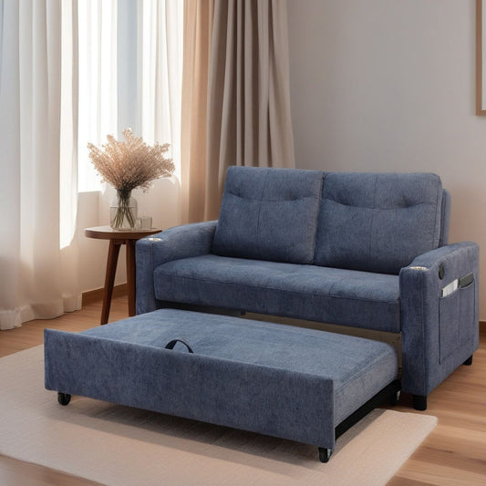 3 in 1 Convertible Sleeper Sofa Bed, Modern Pull Out Couch Bed, Adjustable Backrest, Velvet Loveseat Futon Sofa with Pillows & Pockets for Living Room Apartment, Blue