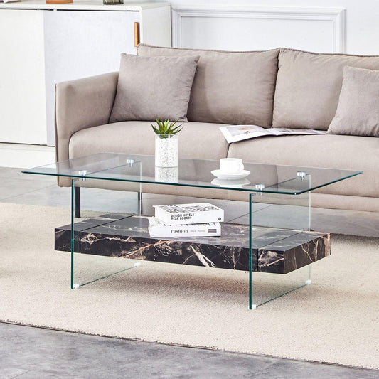 43.3 Inch Modern Two-Tier Coffee Table - An Elegant Combination of Clear Glass and Black Marble Pattern.It can be used not only as a coffee table but also as a side table or display stand.