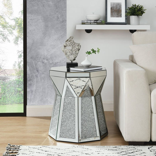 Drum style coffee table with mirror crystal inlay, polygonal silver decorative table, modern design luxury modern furniture, 20 inch (about 50 centimeters) low coffee table, suitable for living room