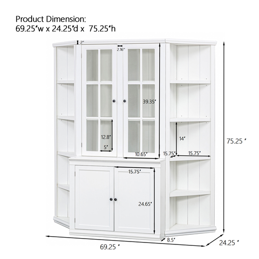 75.25'' Tall Display Cabinet and Two Triangle Sided Bookshelves, 69.25'' Wide Retro Style Wall Suit with Glass Doors, for Hallways, Living room, Office, Studio or Workspace - White
