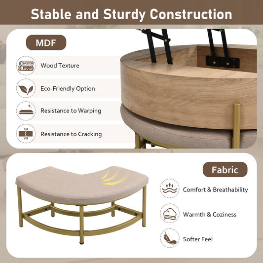 Modern Round Lift-Top Coffee Table with Storage & 3 Ottoman White & Natural