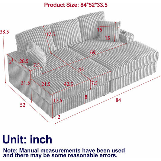 84Inch Corduroy 3-seater sofa With 3 back pillows ,2 toss pillows , 2 ottoman ,2storage spaces and cup-holding grooves Comfy Sofa- Deep Seat Couch for Living Room