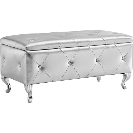 Upholstered Storage Ottoman Bench For Bedroom End Of Bed Faux Leather Rectangular Storage Benches Footrest With Crystal Buttons For Living Room Entryway (Silver)