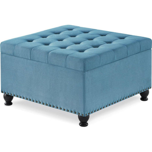 Large square storage ottoman with wooden legs, Upholstered button tufted coffee table with nail trims,Light Blue