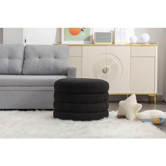 Boucle Fabric Storage Round Ottoman Footstool With Wooden Shelving,Black