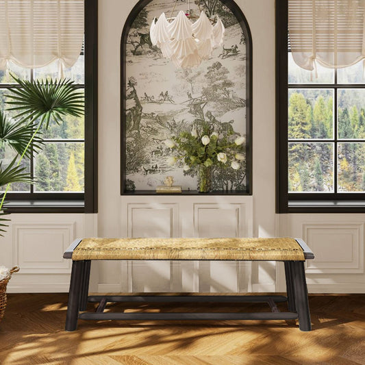 Farmhouse Modern Solid Wood Rattan Bench - Multi-Functional Design Walnut Finish 59 Inch Indoor & Covered Outdoor Bench