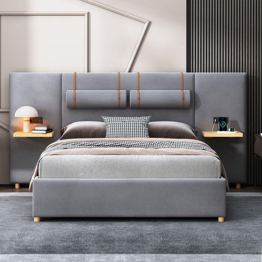 Queen Upholstered Platform Bed, Two Outlets and USB Charging Ports on Both Sides, Two Bedside Pillows, Storage Shelves, Velvet,Gray