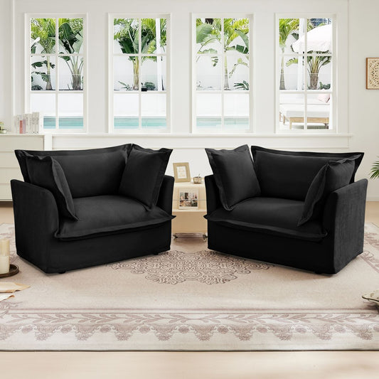 Upholstered Slipcovered Armchair with Ottoman, Deep Seat Armchair W/ Wide Ottoman for Living Room, Armchair Sets with Large Soft Pillows(Set of 2), Black Corduroy Fabric