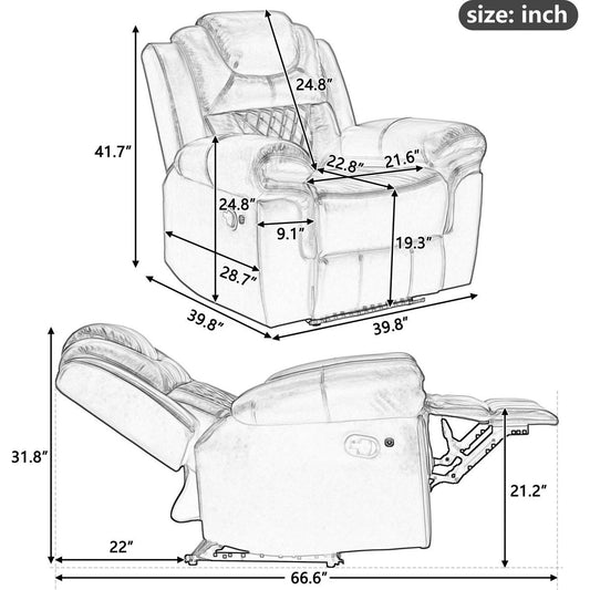 Modern PU Leather Power Recliner with Cooling Cup Holder, Bluetooth Speaker, LED Lights, USB Ports, Tray Table, Arm Storage, Grey