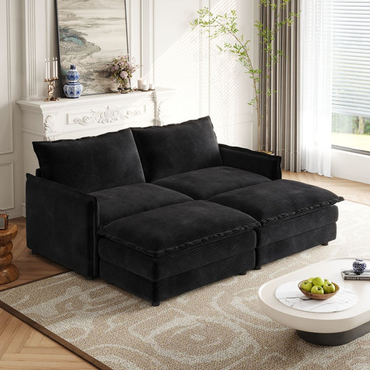 Corduroy fabric 2-seater comfortable cloud sofa with 2 movable footrests for living room, oversized deep-seat recliner, upholstered large-size deep-seat sofa with 2 cushions