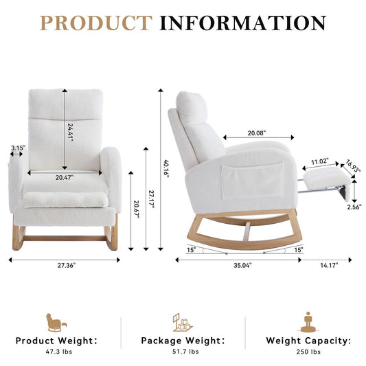 LY-5104 Plush Accent Rocking Chair with Footrest, Cream White High-Back Rocker, Rubber Wood Lounge Chair for Nursery & Living Room, 38.36'W x 26.77'D x 39.76'H