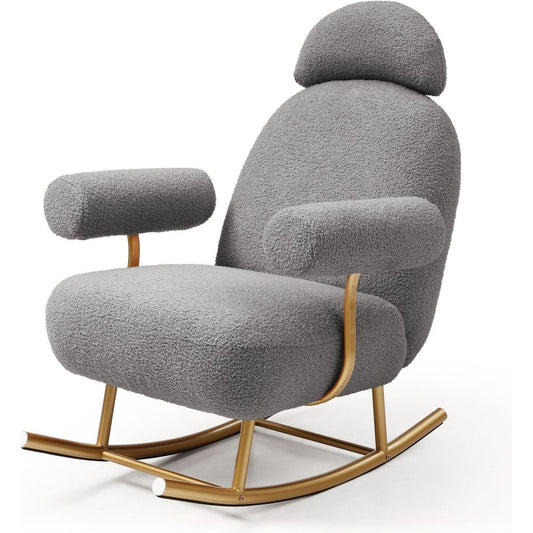 Modern Sherpa Fabric Nursery Rocking Chair, Accent Upholstered Rocker Glider Chair for Baby and Kids, Comfy Armchair with Gold Metal Frame, Leisure Sofa Chair for Nursery/Bedroom/Living Room/Office, Grey